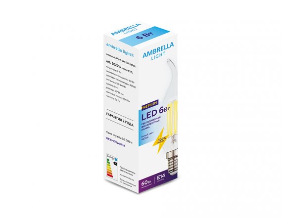 Ambrella 202215 Светодиодная лампа Filament LED C37L-F 6W E14