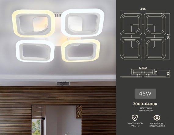 Потолочный светодиодный светильник с пультом FA4371/4 WH белый 4200K/3000K+6400K/6400K+3000K 45W 345*345*75 (ПДУ ИК)
