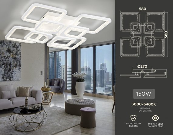 Светильник потолочный светодиодный с пультом FA4423/4+4 WH белый 150W 3000K+6400K/4200K/6400K+3000K 580*580*120 (ПДУ ИК)