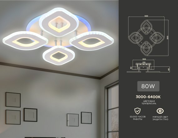 Потолочный светодиодный светильник с пультом FA8841/4 WH белый 3000K/4200K/6400K 80W 500*500*80 (ПДУ РАДИО 2.4G)