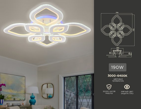 Потолочный светодиодный светильник с пультом FA8844/4+4 WH белый 3000K/4200K/6400K 190W 770*770*120 (ПДУ РАДИО 2.4G)