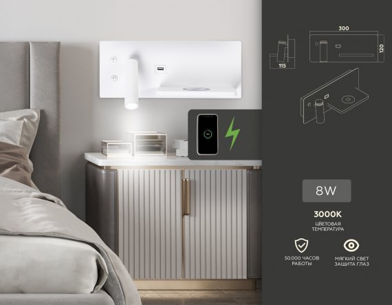 Настенный поворотный светодиодный светильник с выключателем, USB и беспроводной зарядкой FW2971 SWH белый песок LED 3000K 5W+3W 300*120*115