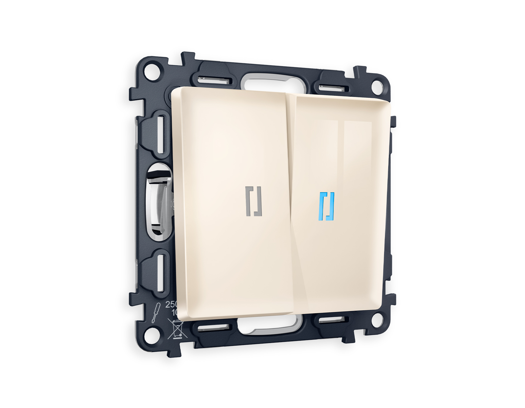 Комплект механизма 2-клавишного выключателя с подсветкой 10000K (голубой свет) ALFA MA304020 Бежевый глянец 10A-250V QUANT (AP3040, VM115, G17B)