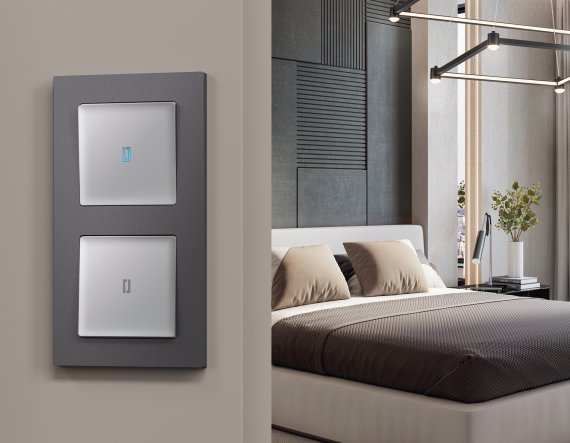 Комплект механизма 1-клавишного проходного выключателя с подсветкой 10000K (голубой свет) ALFA MA402040 Серебро глянец 10A-250V QUANT (AP4020, VM105, G29B)