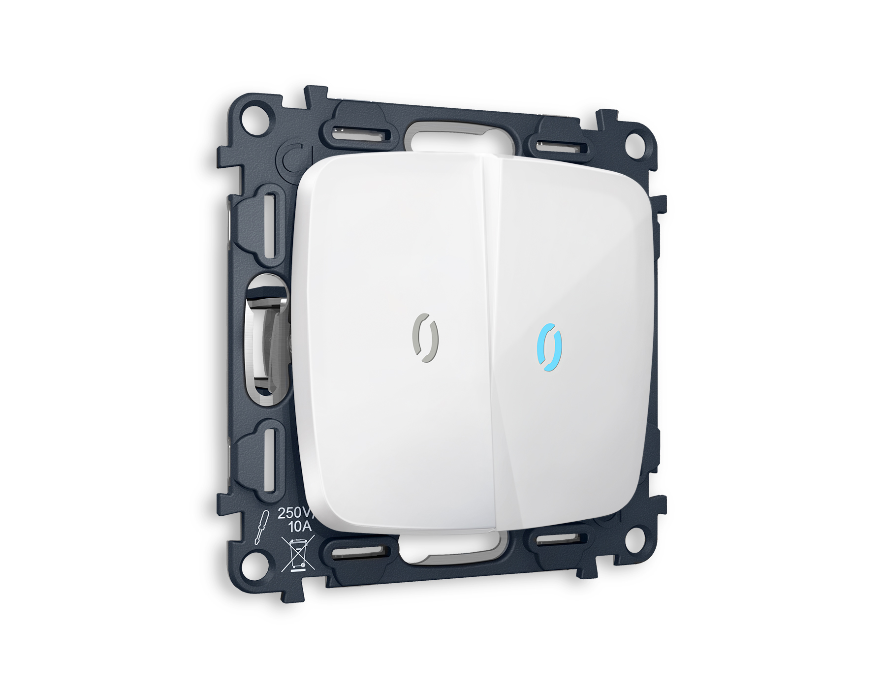 Комплект механизма 2-клавишного проходного выключателя с подсветкой 10000K (голубой свет) OMEGA MO104040 Белый глянец 10A-250V QUANT (OP1040, VM120, G29B)