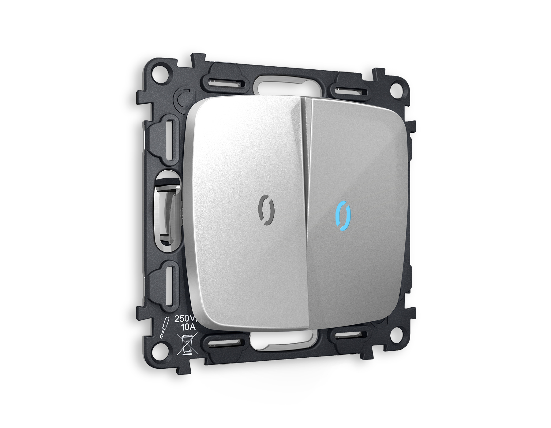 Комплект механизма 2-клавишного выключателя с подсветкой 10000K (голубой свет) OMEGA MO404020 Серебро глянец 10A-250V QUANT (OP4040, VM115, G17B)