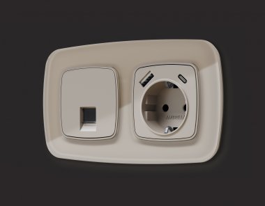 Лицевая панель OMEGA (Серо-бежевый матовый) для электрической розетки с заземлением со шторками 2USB тип A+C QUANT OP3700