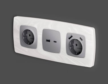 Лицевая панель OMEGA (Сталь матовый) для электрической розетки с заземлением со шторками 2USB тип A+C QUANT OP5100
