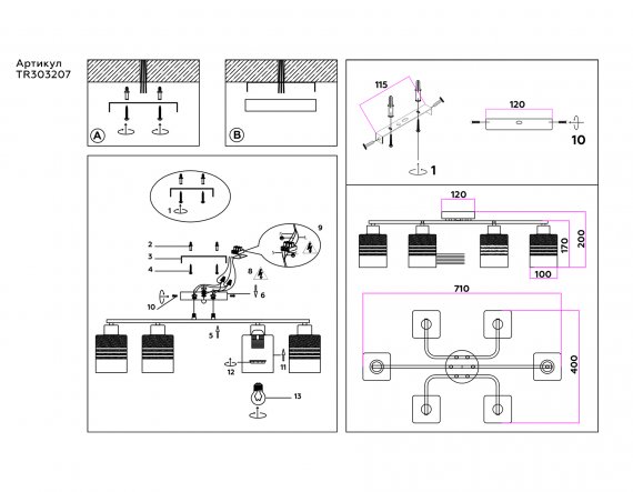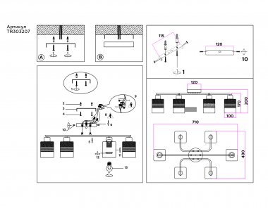 Светильник потолочный TR303207/6 WH/CH/SM/FR белый/хром/дымчатый/белый матовый E27*6 max 60W 710*400*200