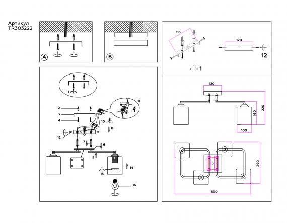 Светильник потолочный TR303222/4 BK/CH/FR черный/хром/белый матовый E27*4 max 60W 530*290*220