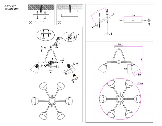 Светильник подвесной TR303294/6 BK/CH/FR черный/хром/белый матовый E27*6 max 60W D590*380