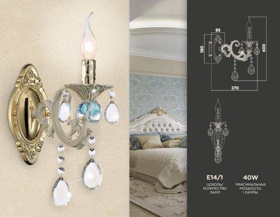 Настенный светильник с хрусталем TR4932 GD/WH/CL золото/белый/прозрачный E14 max 40W 400*120*270