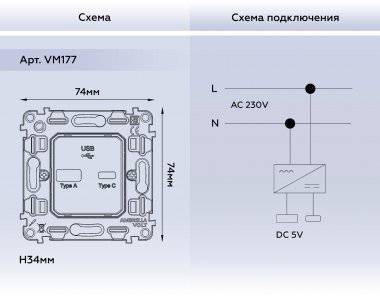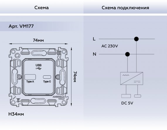 Ambrella VM177 Механизм розетки 2USB тип A+C 20W 3000mA