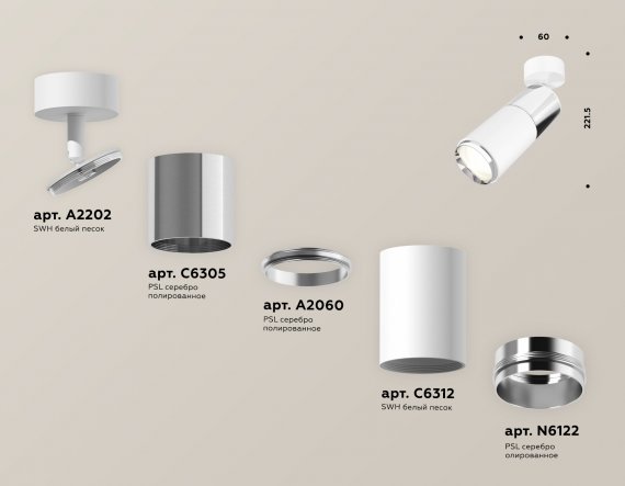 Комплект поворотного светильника XM6312017 SWH/PSL белый песок/серебро полированное MR16 GU5.3 (A2202, C6305, A2060, C6312, N6132)