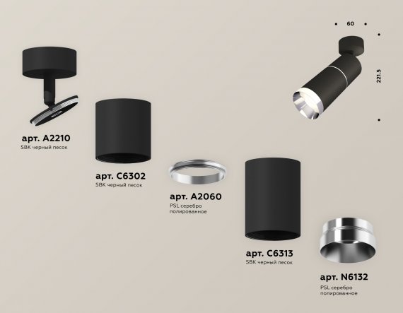 Комплект поворотного светильника XM6313010 SBK/PSL черный песок/серебро полированное MR16 GU5.3 (A2210, C6302, A2060, C6313, N6132)