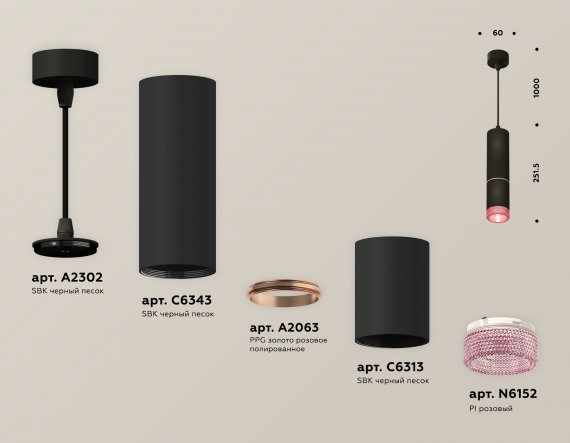 Комплект подвесного светильника с композитным хрусталем XP6313030 SBK/PI черный песок/розовый MR16 GU5.3 (A2302, C6343, A2063, C6313, N6152)