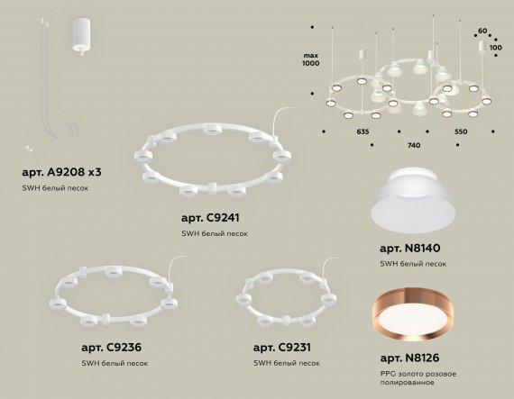 Комплект подвесного светильника с акрилом XR92082020/22 SWH/PPG/FR белый песок/золото розовое полированное/белый матовый GX53 (A9208, C9241, C9236, C9231, N8126, N8140)