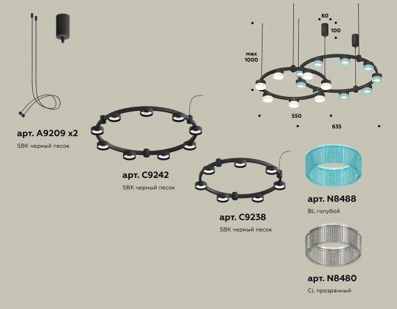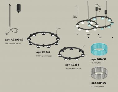 Комплект подвесного светильника с композитным хрусталем XR92091300/16 SBK/BL/CL черный песок/голубой/прозрачный GX53 (A9209, C9242, C9238, N8488, N8480)