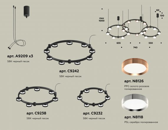 Комплект подвесного светильника XR92092100/22 SBK/PSL/PPG черный песок/серебро полированное/золото розовое полированное GX53 (A9209, C9242, C9238, C9232, N8118, N8126)