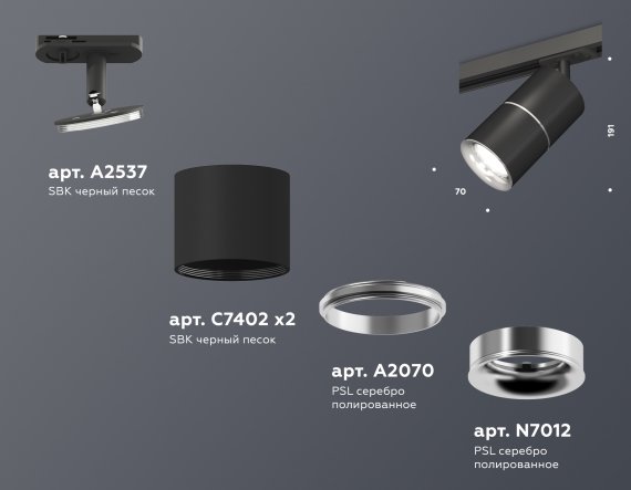 Комплект трекового светильника XT7402011 SBK/PSL черный песок/серебро полированное MR16 GU5.3 (A2537, C7402, A2070, C7402, N7012)