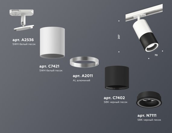 Комплект трекового светильника с акрилом XT7402090 SBK/SWH черный песок/белый песок MR16 GU5.3 (A2536, C7421, A2011, C7402, N7111)